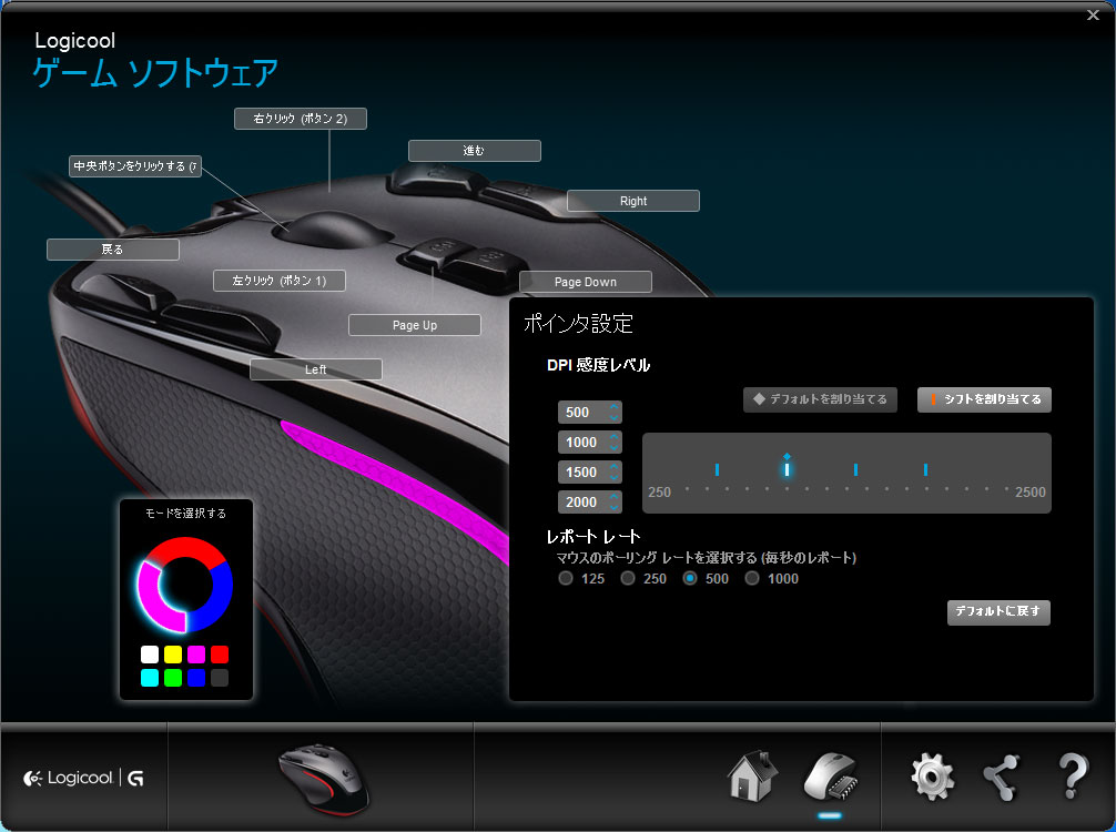 ボタンの割り当て画面です。3つの設定を保存し、設定毎にLEDの色を割り当てます。設定はマウスのボタンで瞬時に切り替える事が出来ます。設定切り替え用ボタン(モードスイッチ)は自分の好きなボタンに割り当てます。この画面でDPIやポーリングレートの設定も出来ます。左は僕の設定です。宜しければ参考にして下さい。